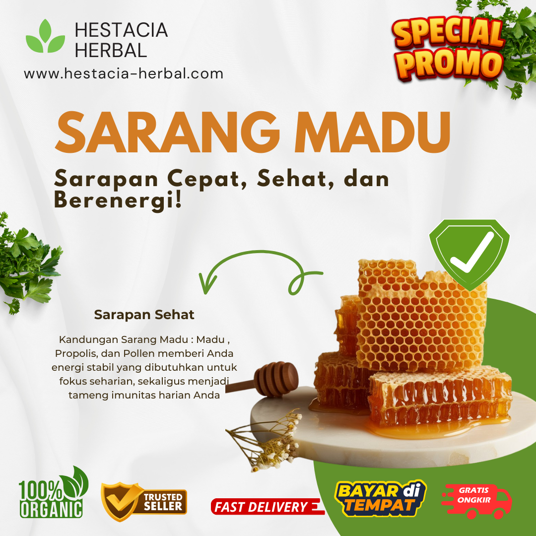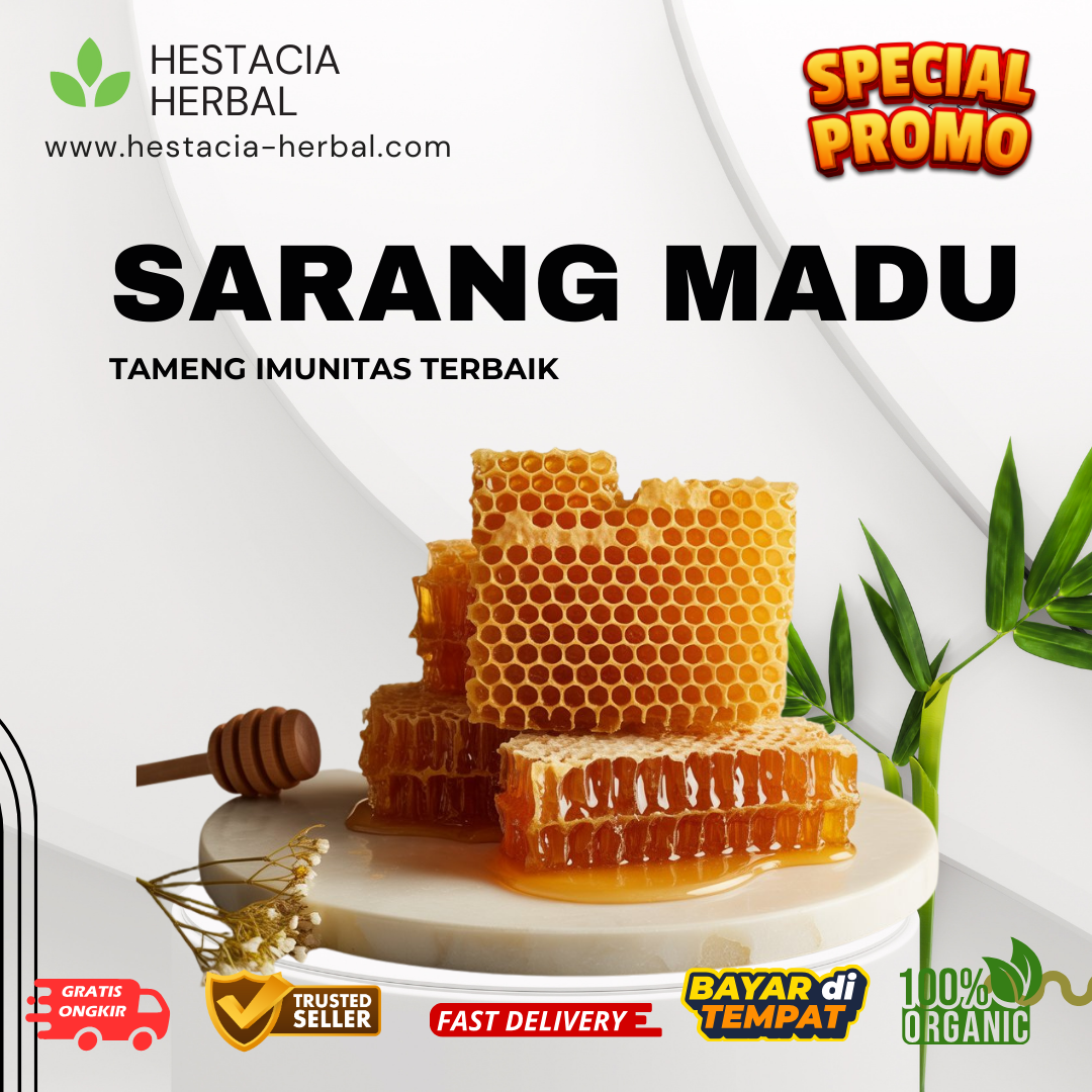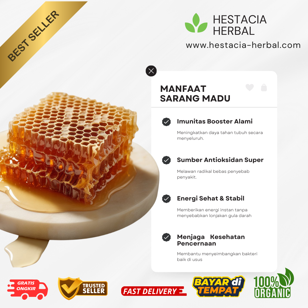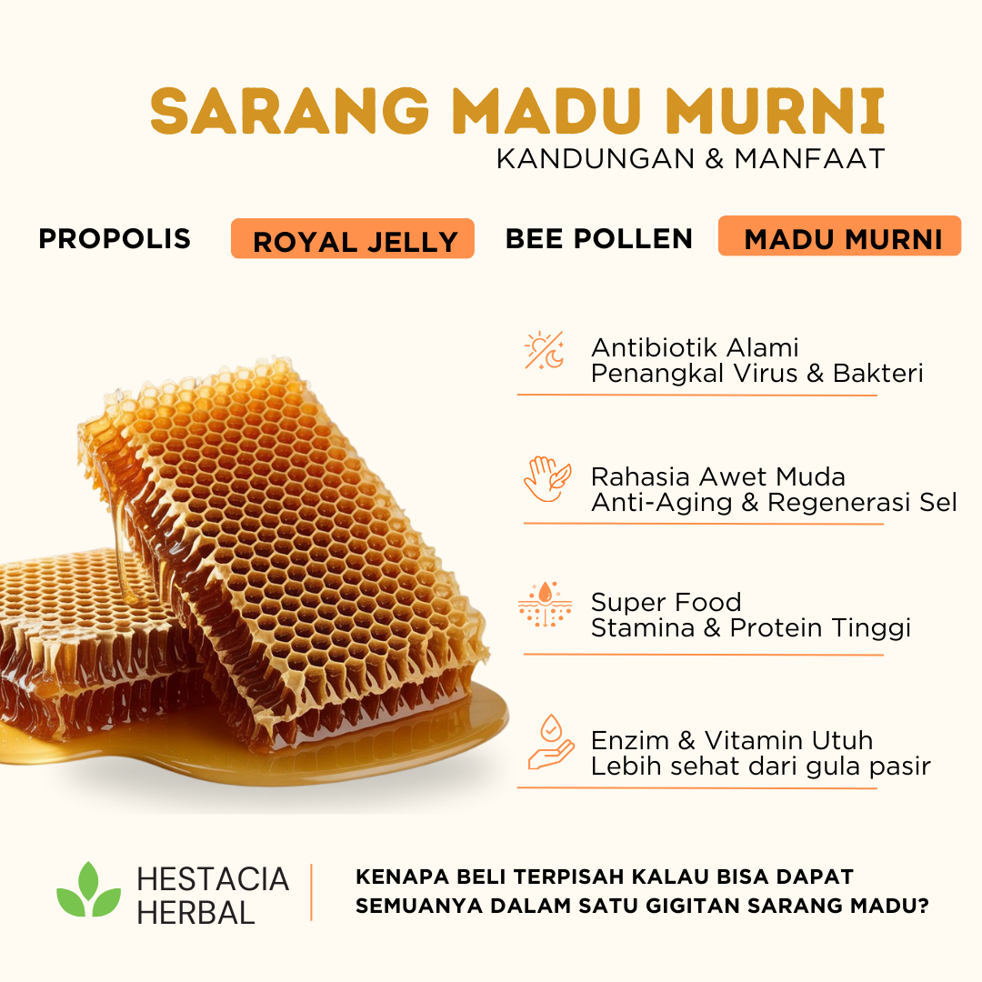 Nikmati kemurnian madu dalam bentuk paling utuh. Sarang Madu (Honeycomb) Hestacia Herbal dipanen langsung dari apiari pilihan tanpa proses pemanasan (non-pasteurisasi) dan tanpa tambahan gula/sirup. 100% Raw Honey yang kaya akan Propolis, Royal Jelly, dan Bee Pollen.
